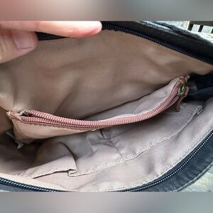 Beautiful vintage style pebbled leather, black with a blue tint. Pretty western style strap, braided zipper pocket tab. Inside is perfect.