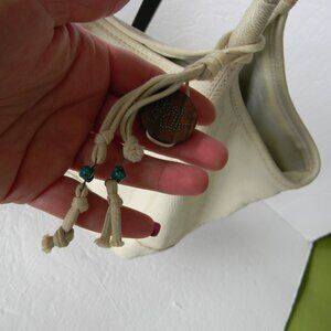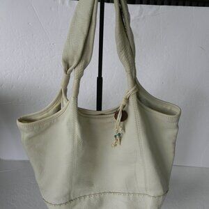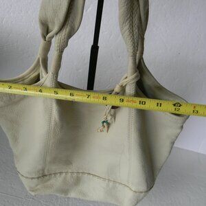 THE SAK CREAM PEBBLE LEATHER LARGE TOTE SHOULDER BAG , GOOD USED CONDITION, SOME OVERALL SIGNS OF USE/WEAR. TWO TOP SOFT LEATHER STRAPS, A CUTE WOOD/TURQUOISE BEAD CHARM. SNAP CLOSURE. SUCH A GREAT LIGHTWEIGHT LEATHER TOTE!