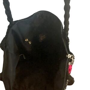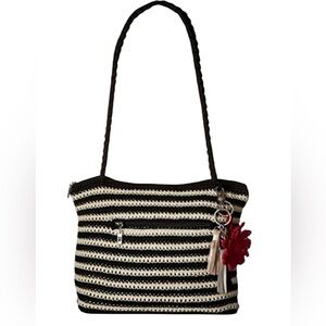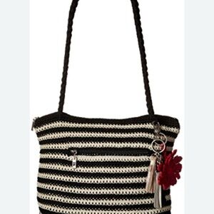 THE SAK Hobo Crochet Knit Black &white Striped w/ pink flower & Tassel charms