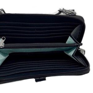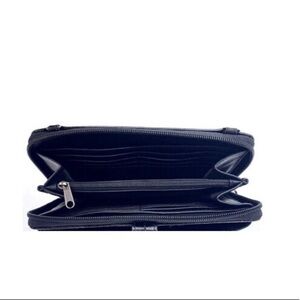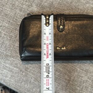 The Saks wallet no holes no rips comes from her non-smoking home. Excellent condition missing the Crossbody strapped any black strap would work.