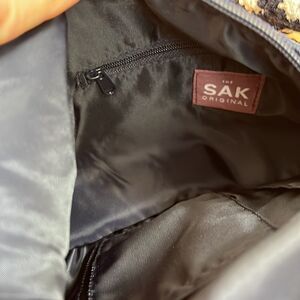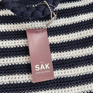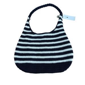 Beautiful NEW Navy / White striped woven bag. Has solid navy braided rope style strap. Navy satin lining. Has one zipped pocket w/ logo. Two open pockets. Hobo over the shoulder style.