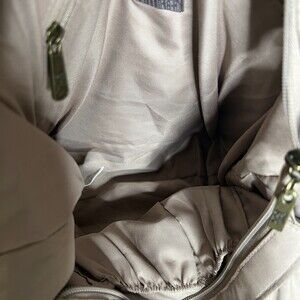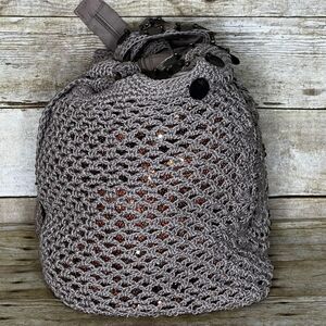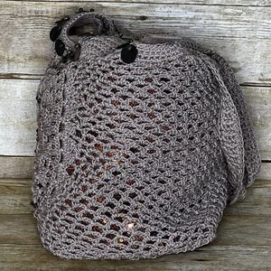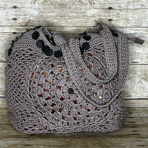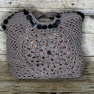 THE SAK SHIITAKE FLOWER ELLIS TOTE. NO FLAWS. VERY CLEAN. MISSING DETACHABLE KEY CHAIN. LINED. INTERIOR FEATURES ONE ZIP POCKET AND TWO OPEN TOP POCKETS. GOLD/COPPER SEQUIN UNDER CROCHETED OUTER. BRASS HARDWARE AND DECOR ELEMENTS. 10"L X 13"H X 6.5"D