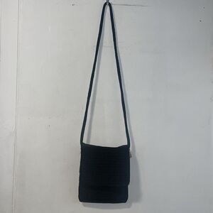 Black sturdy crochet knit exterior with flap over full zip closure, nylon lining with interior zip pocket. Excellent condition. Measures 7.5”W x 8.5”H with a 20” strap drop.