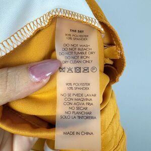 Trendy light orange jogger or track style pants by The Set. Elastic waist with drawstring. White stripes inside and outside the legs. Zipper detail at the bottom. Zipper pockets. Tiny snag as shown but otherwise great condition! No size tag but approximately women’s small to medium.