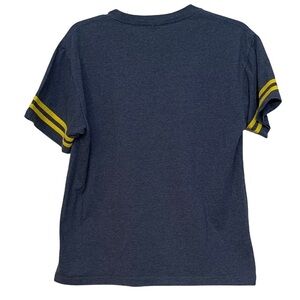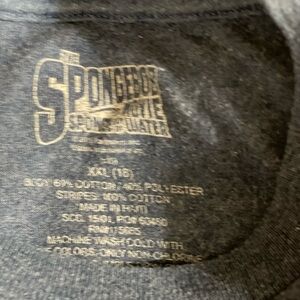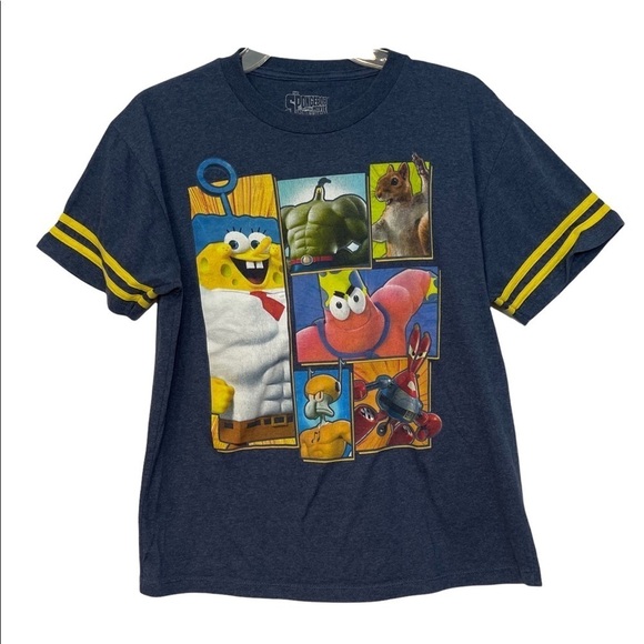 THE SPONGE BOB MOVIE: Sponge Bob Out of the Water — Navy t-shirt. Youth size XXL (18). Yellow striped sleeves. 2015 Paramount movie. Pre-owned. In great condition with no flaws or signs of wear.