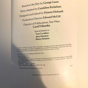 Notes: • On copyright page: "Copyright (c) 1978 by The Star Wars Corporation" and printing number line "1 2 3 ... 8 9 0".• "Story adapted by Geraldine Richelson" on the copyright page• 1st printing had a yellow sticker on front with "$4.95 PEEL OFF". There is no other price on book.• Cover is a publicity still.• Book is unpaginated, 60 pages by count.