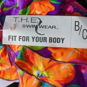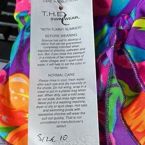 Details: T.H.E. Swimwear Tummy Slimmer cover up skirt multicolor floral pattern size 10 it does NOT have a built in bottom it is just a skirt! the front is shorter then the back.