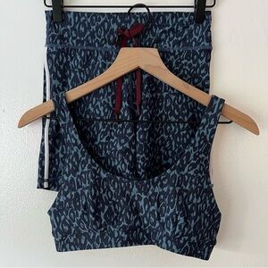 This leopard-printed sports set from THE UPSIDE is made from a stretch technical fabric that is buttery soft. The sports bra has a comfortable fit and elasticated underband ensuring support while working out. The biker shorts have an elasticated waist band with a drawstring to adjust the waist, and a white stripe going down the sides. Both items sport a denim-blue colorway with an allover leopard print. Both are in excellent condition.