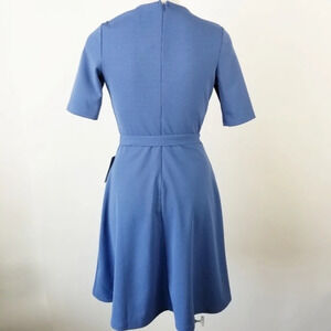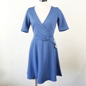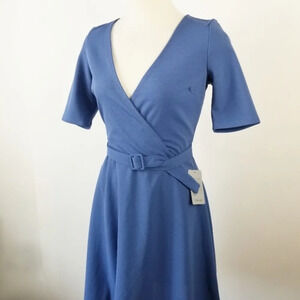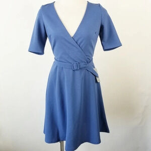 flared skirt is accentuated with a belted waist on this surplice dress. Surplice neck. Elbow length sleeves. Back hidden zip closure. Removable waist tie. Knit construction.