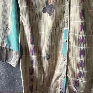 Multicolored printed crepe (100% Polyester). Top. Long sleeves. Collared neckline. Front button closure. 38.5" from shoulder to hemline. Imported.