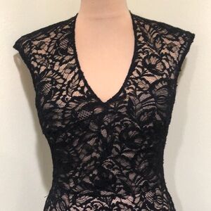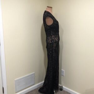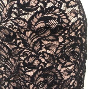Very good condition no stains rips or fading on the exterior. There is wear on the bodice inside but lace covers it so the wear is not visible when worn. Short sleeve, cap sleeve, v-neck, sheath silhouette, cut out back gown. Zips and buttons in back. Black floral lace with tan lining. There is some stretch. It is modeled on a mannequin with 36.5” bust and 28.5” waist and was a little tight, so it would better fit a true size 4. It has boned and lightly lined corset inside but no thick padding on the bust.