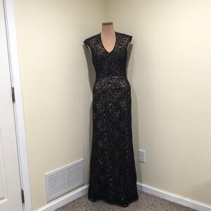 THEIA A Night To Remember Maxi Dress Size 4 Black Nude Floral Lace Cutout Gown