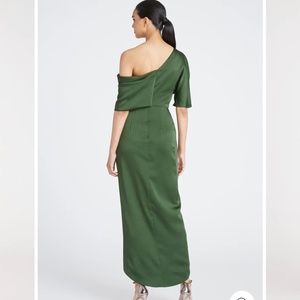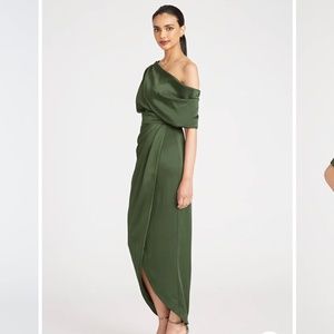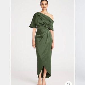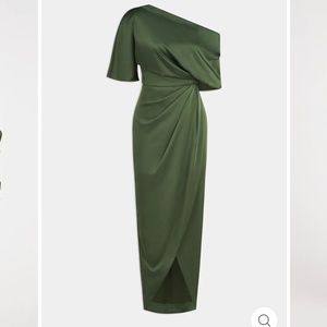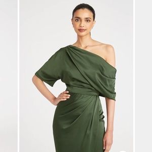 This is a very flattering and absolutely gorgeous dress. As a mother of the bride dress, it covers all the right spots like upper arms and also disguises a little bit of a belly because of the way it wraps on the bottom. This dress was only worn once for a couple of hours. It is very well made and very high quality with thick fabric. It is very hard to find sizes online because it is always sold out. I had to try for months to find my size by looking on the websites almost every single day. It is only sold at a couple of very high end Department stores. It is a beautiful olives green color that is complementary to blondes as well as brunettes.