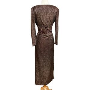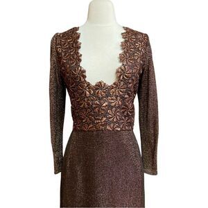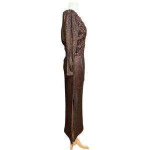 Seriously this gown is so intricate and unique. Unique Side zip with slit. The most unusual almost deep rectangular floral shaped neckline. Glittery knit. Just a total work of art and the perfect color for fall weddings! Plus it’s one of a kind handmade- so no one else will be wearing it!
