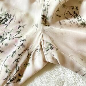 theory pants, silk floral pants, blush trousers women, botanical print pants, tapered leg trousers, theory size 6, elegant silk pants, soft floral trousers, workwear trousers, spring pants women, minimal chic outfit, neutral aesthetic pants, luxury brand trousers, lightweight silk bottoms, feminine style pants