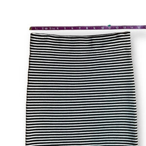 Soft, stretchy rayon (viscose) blend knit skirt from Theory. Bright white and black skinny horizontal striped pattern. Elastic waist, very stretchy but also thick.