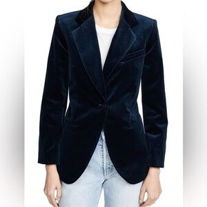 In excellent preowned condition, this single-button Theory blazer is tailored at the waist, hits at the hip, and is crafted of rich dark brown/chocolate velvet fabric.