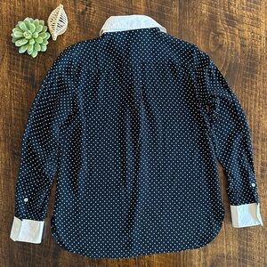 From website: A menswear-inspired straight-fitting shirt with a contrasting white point collar and cuffs and covered button front. Elevated in a polka dot viscose Moroccan crepe from a premium mill in Italy.