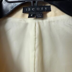 This unbelievably gorgeously tailored fit THEORY blazer is in great condition. UNDER THE LEFT LAPEL there is a slight red lipstick stain and previously a small pen stain next to it that is almost completely.