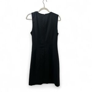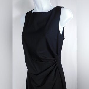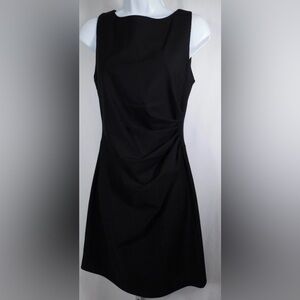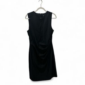 Sleek, sophisticated, and endlessly versatile, this Theory black sheath dress is the epitome of modern minimalism. Crafted from a smooth, structured fabric with a subtle sheen, it features a sleeveless silhouette, a classic crew neckline, and elegant draped detailing along the waist that flatters the figure with understated sophistication. The tailored fit and above-knee length make it perfect for both professional and evening settings — pair it with heels for a polished office look or statement jewelry for cocktail hour. Finished with a concealed back zip closure for a seamless finish.