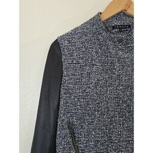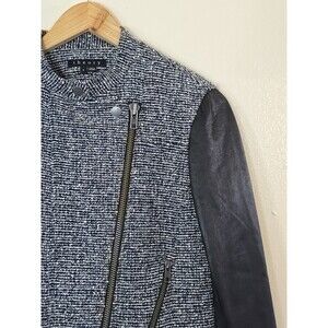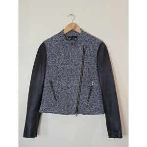 The Theory Kinde C Tweed Lambskin Leather Moto Jacket in navy black, size 8, is a stylish and versatile outerwear piece designed for women. Made from a cotton blend tweed fabric, this jacket features a zip and button closure, long sleeves, and a collarless design with a peplum style hem. The jacket is lined with polyester and includes pockets for added convenience. Perfect for various occasions such as travel, parties, casual outings, and business meetings, this designer jacket is a fashionable choice for the colder seasons of winter, fall, and spring.