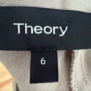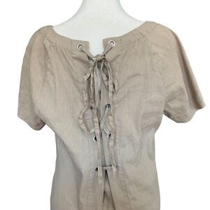 Theory linen blend Keshelle shift dress with a lace up back featuring silver grommets. Pleated back detail. The taupe color fabric has a bit of texture.