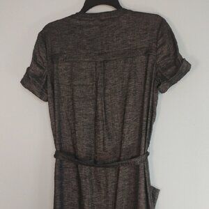 THEORY rolled sly shirtdress in heather gray. Made with linen blend maxi shirt dress, it has belt and button-down closure for a versatile look. It features rolled short sleeves, round neckline and side pockets. High slits on the side. Ideal for versatile styling. Made with 66% Linen 32% Viscose 2% Elastane. Has normal piling on a linen fabric. No rips or tear. Please zoom in photos for the best description.