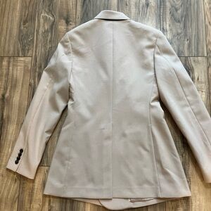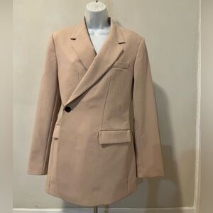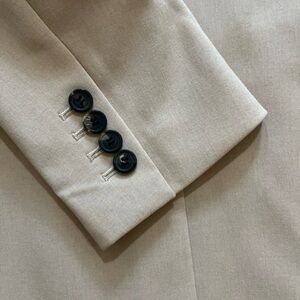 Light shoulder pads, one button closure and one anchor inside. Front flap pockets.