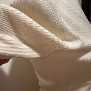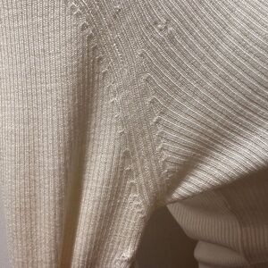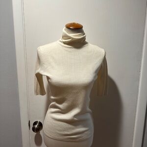 This short-sleeve, rib-knit turtleneck sweater is made of luxurious fine-gauge merino wool knit in Italy.