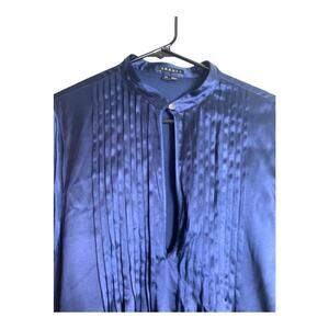 Theory Silk Long Sleeve Navy Blue Pleated Keyhole Blouse, M