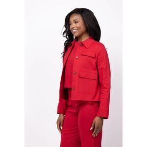 Utility-inspired details, like three oversized flap pockets and button cuffs, lend a modern edge, while the vibrant red hue makes it a statement piece whether paired with matching shorts (sold separately) or styled casually with jeans or tailored trousers.