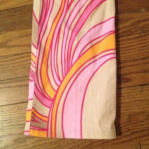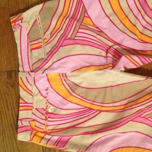 Cotton/Lycra blend pants by THEORY. Zip button closure, back pockets belt loops. Very colorful with dark and light pink, tan and marigold coloring. In perfect condition!