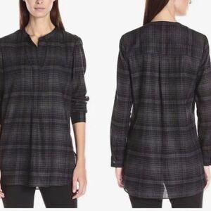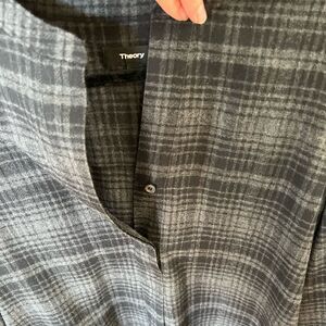 Theory 100% wool dark grey and black plaid v neck with button. Excellent condition.