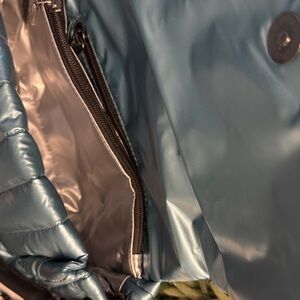 Chic puffer design with a metallic blue finish. Features a sturdy chain strap for a modern look and a seat belt like strap to be used for cross body.