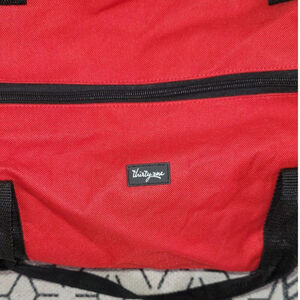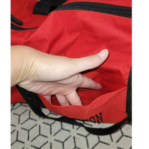 THIRTY-ONE BAGS SMALL RED DUFFLE TOTE BAG IN RED, W "LANDON" in BLACK