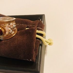 This Ring , the 2 times I wore it, got a lot of compliments. It’s unique and eye catching. 👁♥️🌺. 2.20 Garnet Ring and 3 mm Freshwater Pearls in Sterling Silver over 18k Gold. There are 4 Pearls button size.