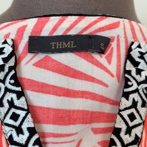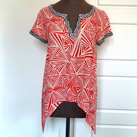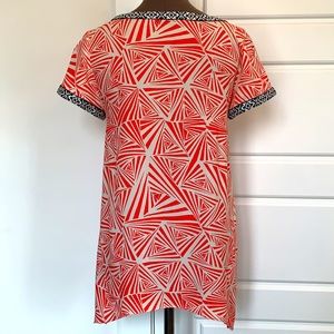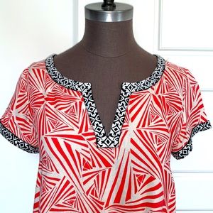 THLM cute cap sleeve coral and ivory geometric print top with contrasting black and ivory trim at neck and sleeves. Hem line is shorter in front and longer on the sides and in the back..