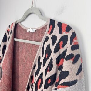 Gorgeous duster length cardigan by THML. Purchased at a boutique! Open front. Beige base with black & orange leopard spots. Gray blouson style sleeves. Nice length. Great quality knit. Oversized slouchy fit. Never worn! Excellent condition. Women’s size medium.