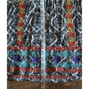 This THML Tunic is the essential, vibrant piece your closet has been waiting for. With its bold black and white damask print and stunning purple, orange, and teal embroidery, this dress screams high-end Bohemian resortwear. The playful orange tassel ties at the keyhole neckline add a perfect finishing touch. (You can already imagine how easily this flows for vacation, or how chic it looks with leggings.) As a favored brand by Anthropologie, the quality and unique design are undeniable. Seize the opportunity to own this effortless boho style right now. Size Small.