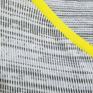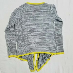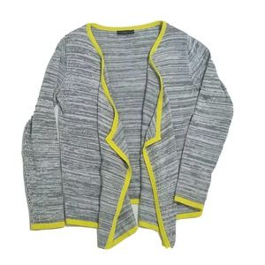 Open knit cardigan with a drape front. Gray knit with a yellow trim. Long sleeves. Made of an Acrylic/Cotton blend. Pre-owned and in good condition.