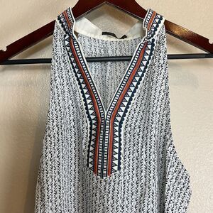 THML Anthropologie Women Sz XL White Navy Halter Top Embroidered Bohemian Blouse N3 Elevate your summer wardrobe with this stunning THML Anthropologie halter top. The white, navy, and orange geometric pattern is beautifully embroidered on a sheer chiffon fabric, making it the perfect flowy and breathable option for any summer, fall, or spring occasion. The collarless and sleeveless design features a round neckline and racerback strap type, with a button closure adding a stylish touch. The contrasting trim and bohemian theme of this blouse make it a unique addition to any wardrobe, whether you're going to a party or a casual outing. Available in size XL and made of 100% rayon and 100% polyester material, this regular fit tunic is easy to care for with hand wash only instructions. EUC Great Condition!! No stains or flaws. Pit to Pit 20" Shoulder to Hem 25" Top Seller!! Fast and reliable shipper. Accepting reasonable offers. Thanks for shopping by. YOU ROCK!!