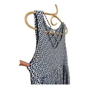 A great addition to add to your summer closet . A casual stretchy knit top which is slightly longer in the back . Wide Bottom that is flowy THML Blue White Knit Sleeveless Patterned Criss Cross Neckline Peplum Top Small