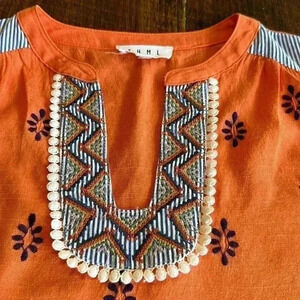 Nice pre-worn condition, no flaws to note. Pretty embroidery on front, around v-neck and contrasting fabrics. Orange is a little softer in person that in photos.