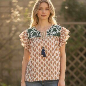 🌿 Beautifully detailed and effortlessly boho, this top features an all-over floral print with a contrasting green floral yoke, puff sleeves, and playful rope tie with tassels. Made from a lightweight blend of 95% cotton and 5% polyester for breathable comfort. Size XS.