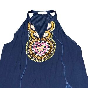 THML V Neck Boonie Embroidered Dress Sleeveless Sundress Tassels Lined Boho Sz Medium Blue