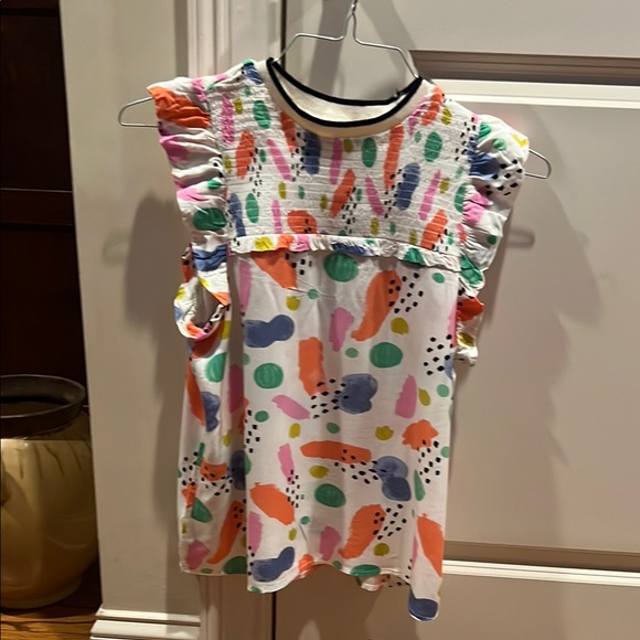 Vibrant sleeveless top with playful brushstroke design. Features ruffled shoulders and a mix of colors. Ideal for casual wear.