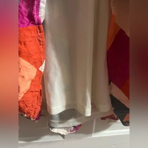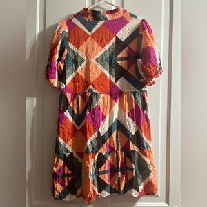 THML dress with geometric patterns. Features shades of orange, pink, and green among other colors. The puffy style short sleeves, v-neck, and full lining make this a beautiful and high quality dress