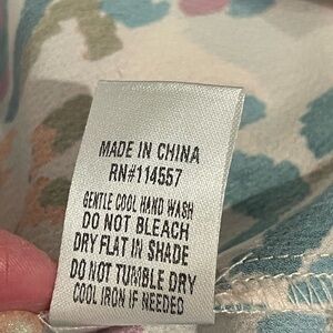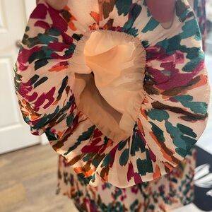 Vibrant blouse with abstract design. Features teal, pink, and orange hues. Perfect for versatile styling.