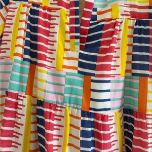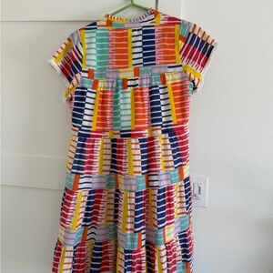Vibrant mini dress with multicolor stripes. Short sleeves. 36 inches from shoulder to hem.