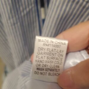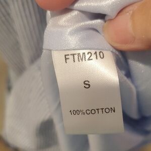 It is a summery, sleeveless dress with a chambray striped pattern and navy blue embroidery detailing around the neckline and hem. The dress has thin straps and a loose, flowy fit. Based on search results, similar THML dresses are made from 100% cotton or a blend of cotton and polyester. The style is described as boho or hippie-inspired, suitable for casual wear. The length appears to be mini or short, falling above the knee. THML is a brand known for its fashionable and comfortable designs, particularly its sleeves, which are not a feature of this dress